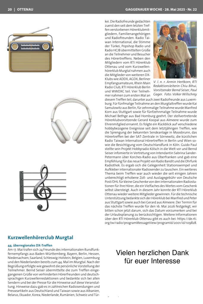 Hörertreffen am 17. Mai 2025 44. überregionales DX-Treffen des Ottenauer Kurzwellenhörerklubs Murgtal mit RTI Hörertreffen am 17. Mai 2025