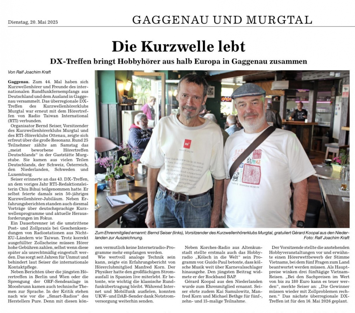 Am Samstag 17. Mai 2025 trafen sich 24 Freundinnen und Freunde des internationalen Rundfunkfernempfangs aus Baden-Württemberg, Bayern, Berlin, Hessen, Niedersachsen, Saarland, Schleswig Holstein, Belgien, Luxemburg und den Niederlanden bereits zum 44. mal im Murgtal. Zum ersten mal nahmen Joachim Gregor und Günter Butz aus Deutschland sowie Arnold Heiles und Joe Leyder aus Luxemburg am Treffen teil. Insgesamt nahmen an den überregionalen DX-Treffen seit 1980 insgesamt 407 verschiedene Personen aus Deutschland, Argentinien, VR China, Ekuador, Frankreich, Luxemburg, Niederlande, Österreich, Schweiz, Slowakei und Taiwan teil.