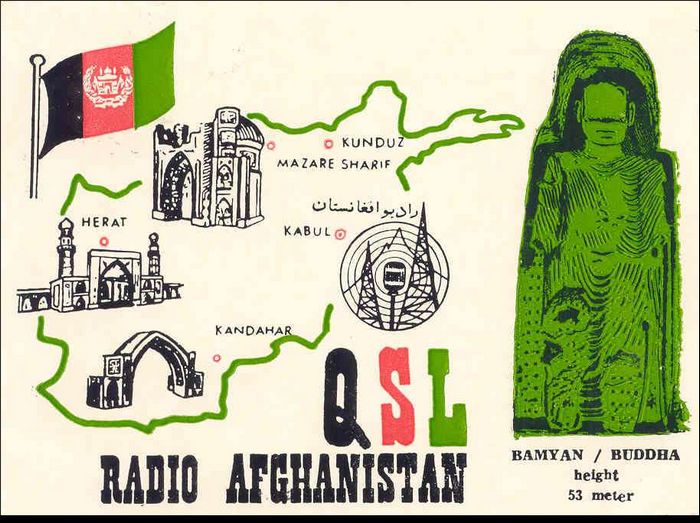 German Service of Radio Afghanistan, 11785 kHz, March 1973. Being a kingdom at that time the QSL was only changed afterwards with covering the old flag with the new one.