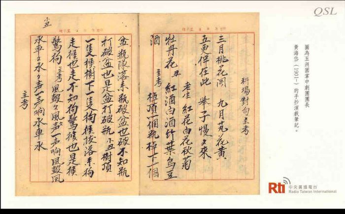 Huang Hai-tai (1901-) is the leader of Wuchou Garden Puppet Theater. One page from his manuscript. RTI German 7780/Florida in October 2007.
