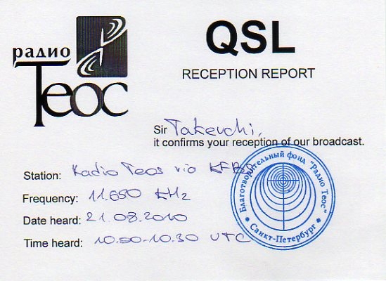 QSL for reception via KFBS (via Hironori Takeuchi, Japan).
