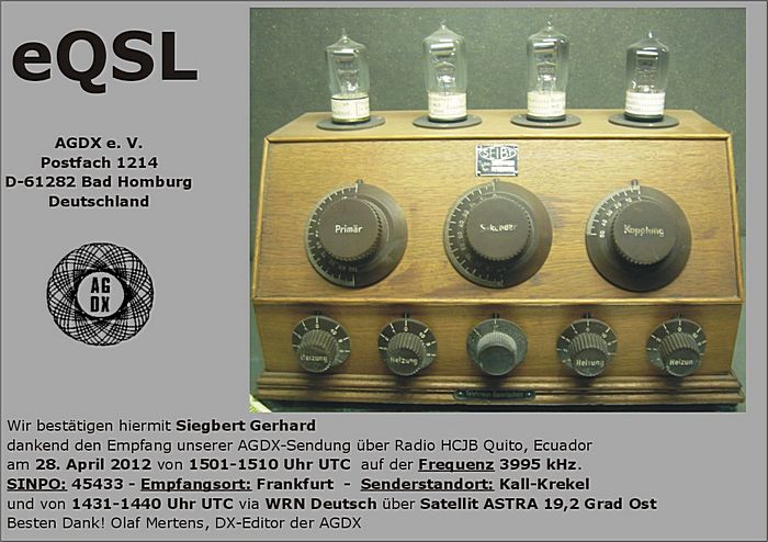 eQSL 2012 for Reception of DX programme via HCJB, Kall-Krekel, Germany on 3995 kHz (via Siegbert Gerhard).
