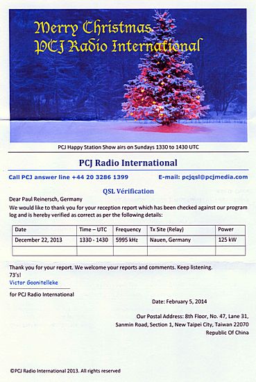 PCJ Radio International on 5995 kHz via Nauen, Germany (Paul Reinersch).