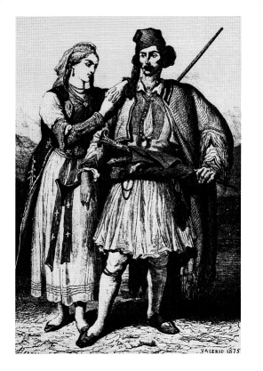 Die Abbildung zeigt ein südalbanisches christliches Paar (Vorlage von 1875)