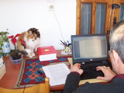 Zu Hause beim Fotoautor: Xhina wacht, ob er alles richtig schreibt: sie schaut in ein neues albanisch-deutsch/deutsch-albanisch Wörterbuch© 2008 Astrit Ibro